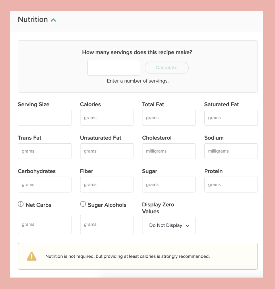 Once you've gotten started with Create, and you've created a recipe, you will want to fill out the nutrition information.