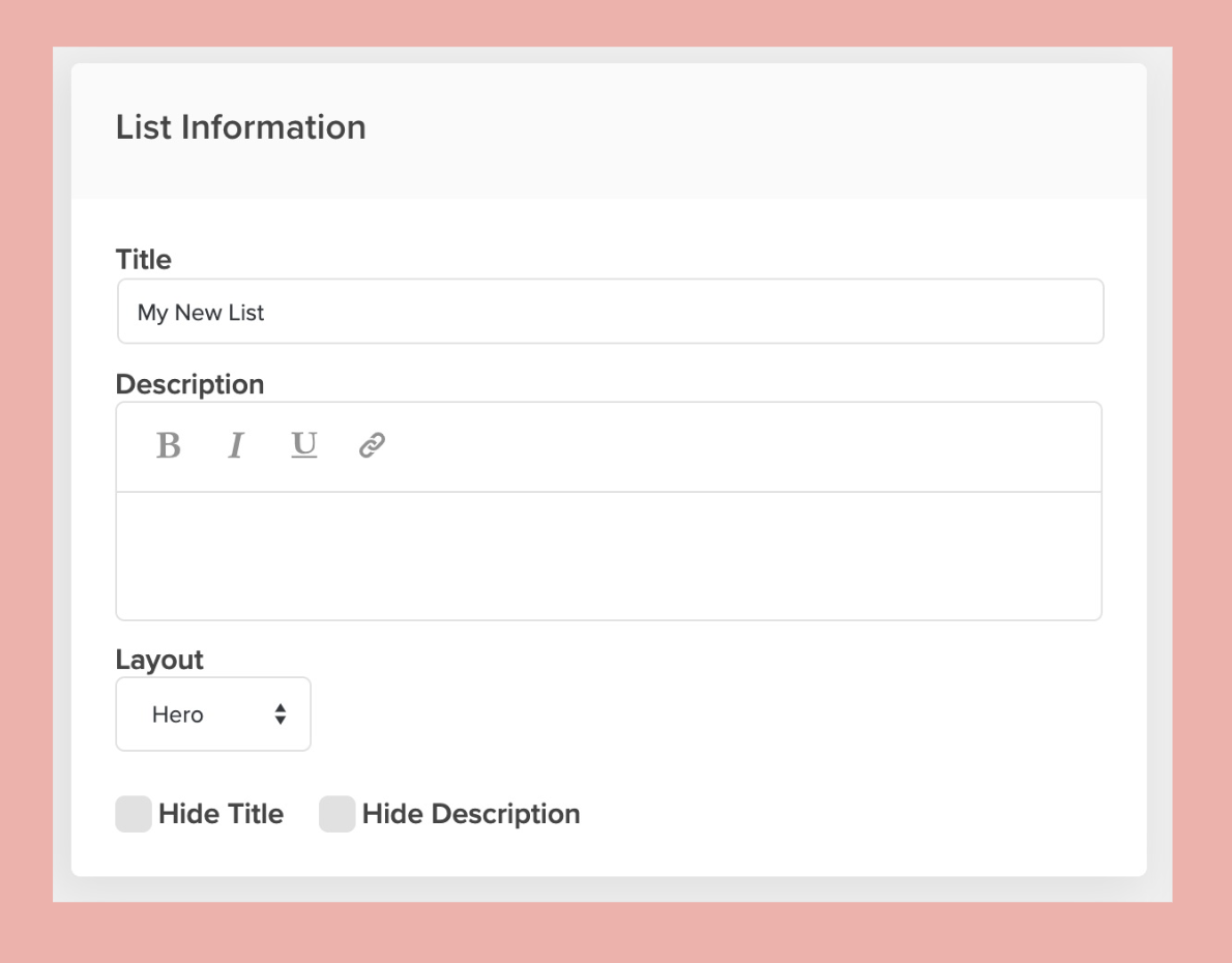 Once you have a brand new list created, the first thing you will do is to give it a name.Remember, the name is going to be visible on the live site, so make it engaging and descriptive about what'll be included in the list itself.