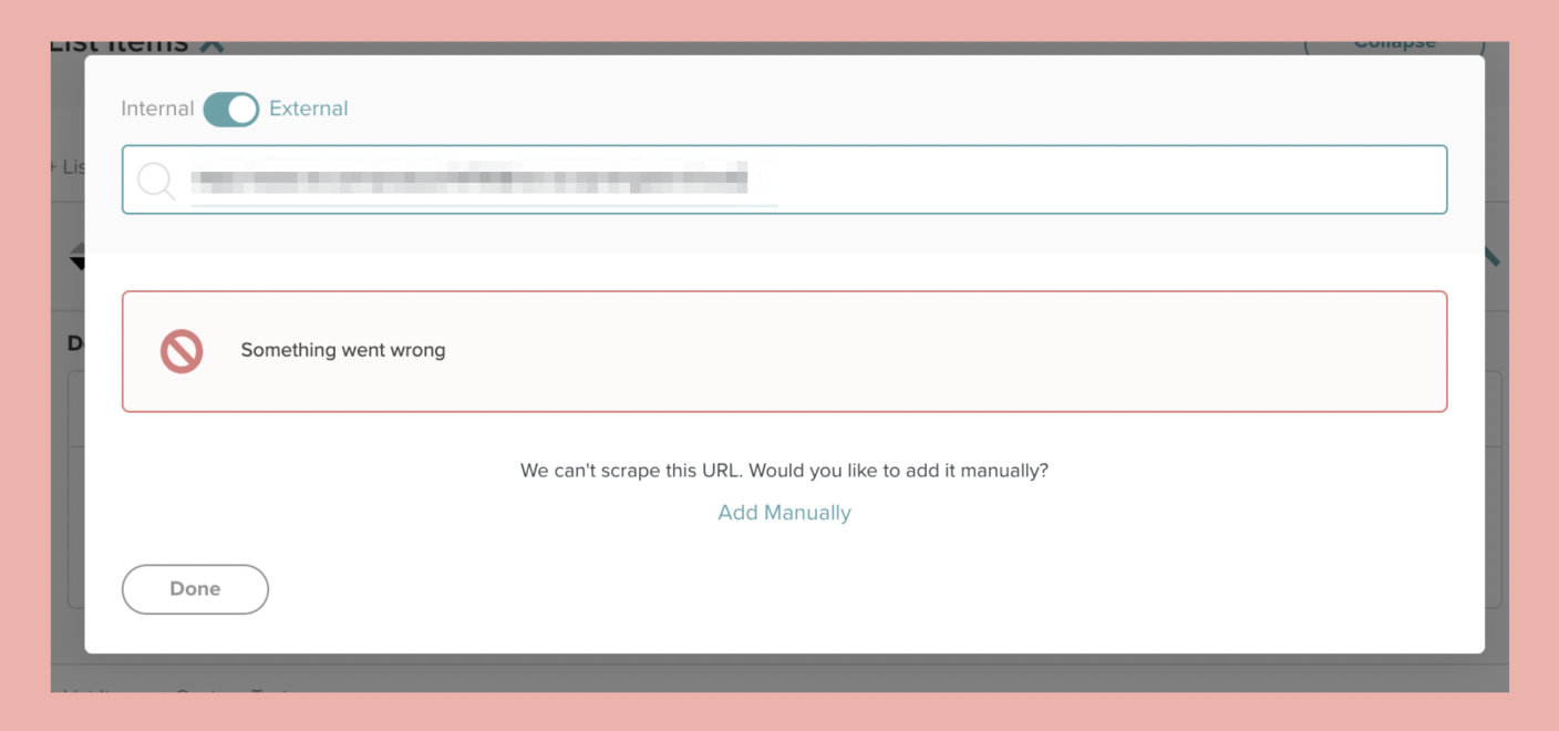 When trying to add an external link to a Create List, you may get the below error message (or something similar) because the information from that link is unable to be pulled into Create.