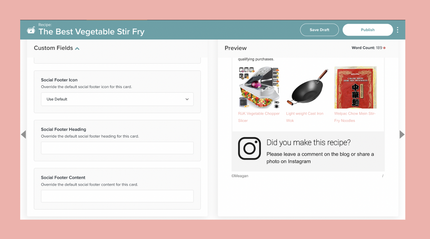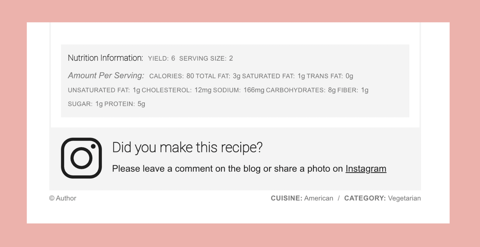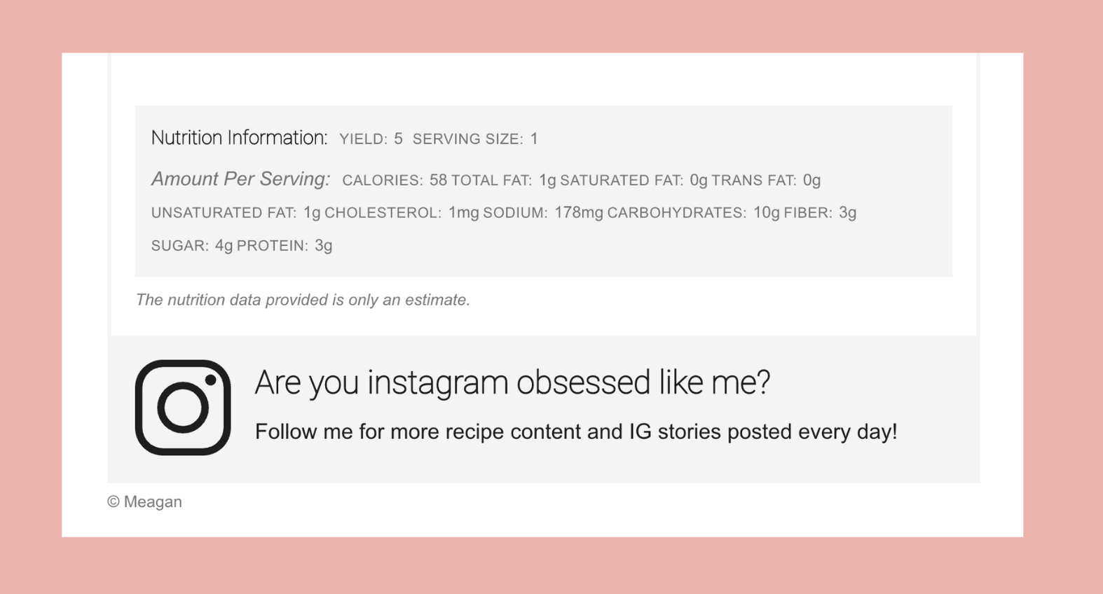 Step 2: Once you add in your custom fields, preview! This is how it would look if I were to override my global settings for one of my Recipe cards so that I can encourage readers to follow me on Instagram instead of Pinterest.