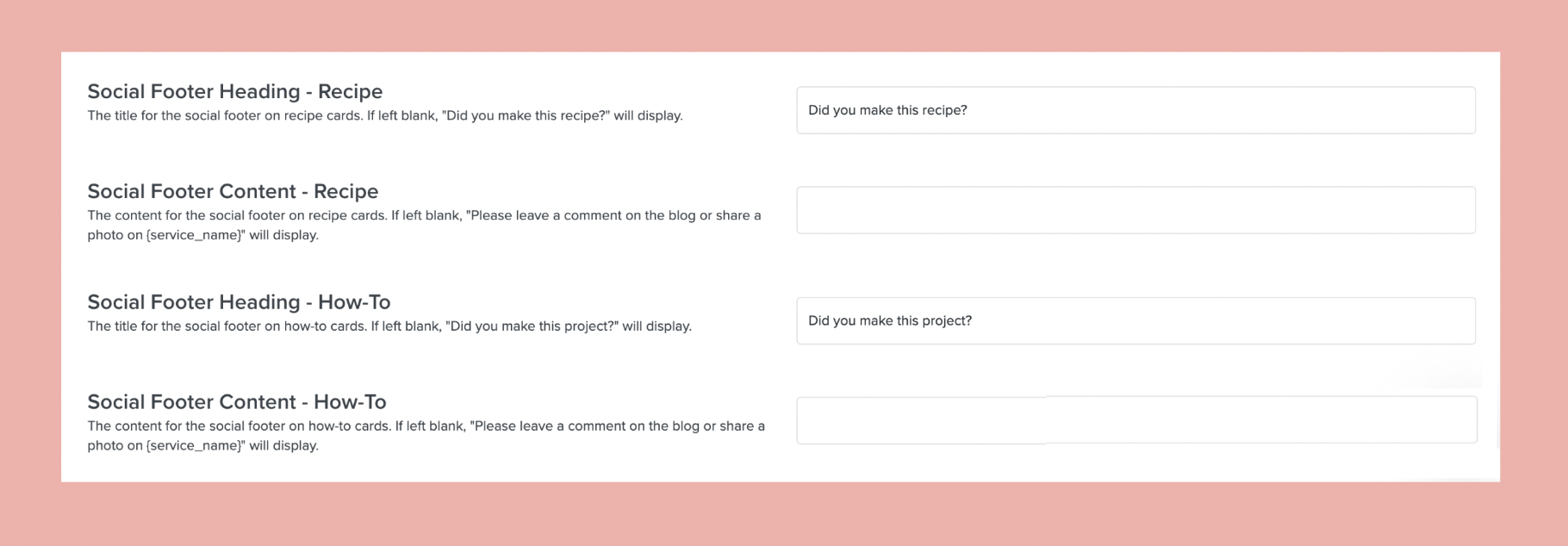 Step 3: Add in a Social Footer Heading and Social Footer Content for your Recipe cards and/or your HowTo cards. If you leave these fields blank, the default text will display.
