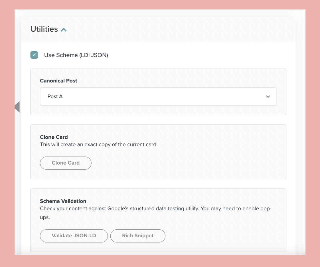 If the Create card you are using has nothing to do with the main content of your post. Schema tells Google information about your content. If the card outputting Schema is not relevant to your post’s content, Schema should be off.