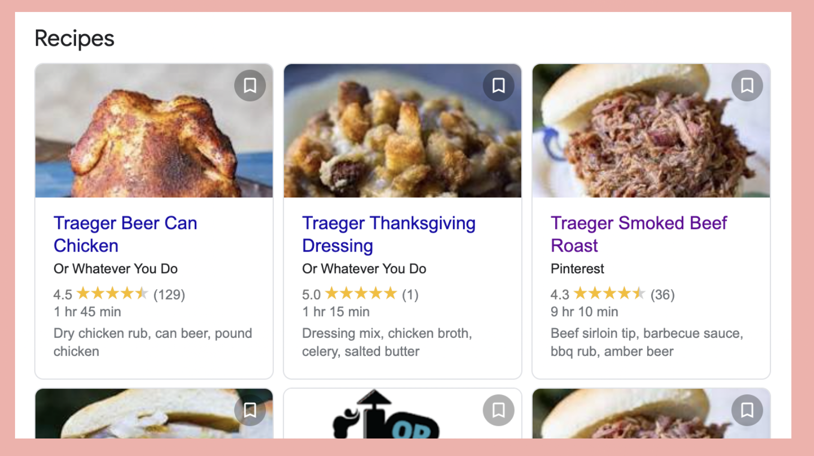 By way of Schema, Google uses the info that you put into your Create card to have something to display in those Rich Results (image, ratings, ingredients, etc.)
