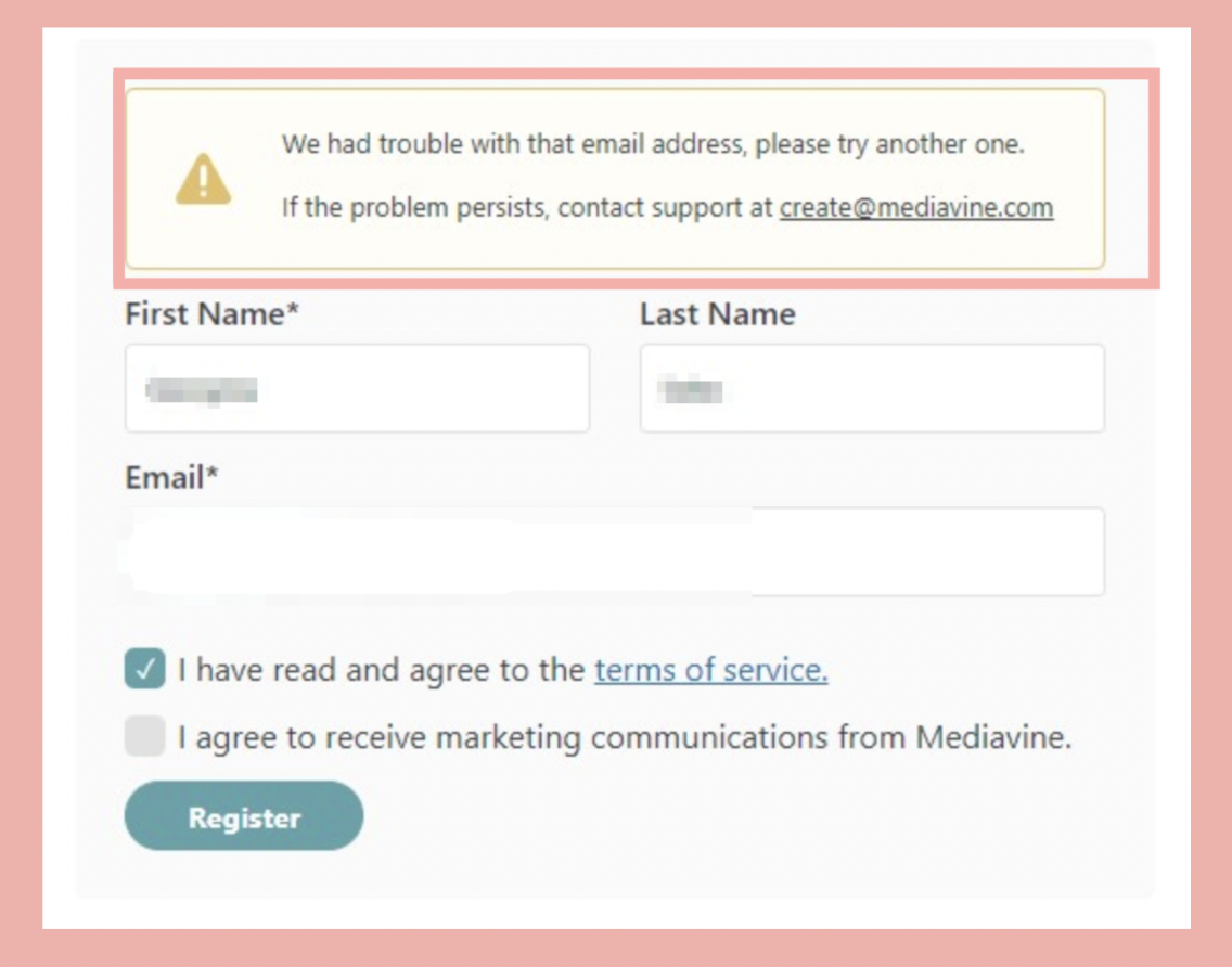 Some of Create’s features require a quick email registration. Depending on your site setup, occasionally you can run into roadblocks while registering. When this happens, there are three types of common errors you may see. The troubleshooting process is similar for all three, as the problem here is generally caching or an extension conflict.